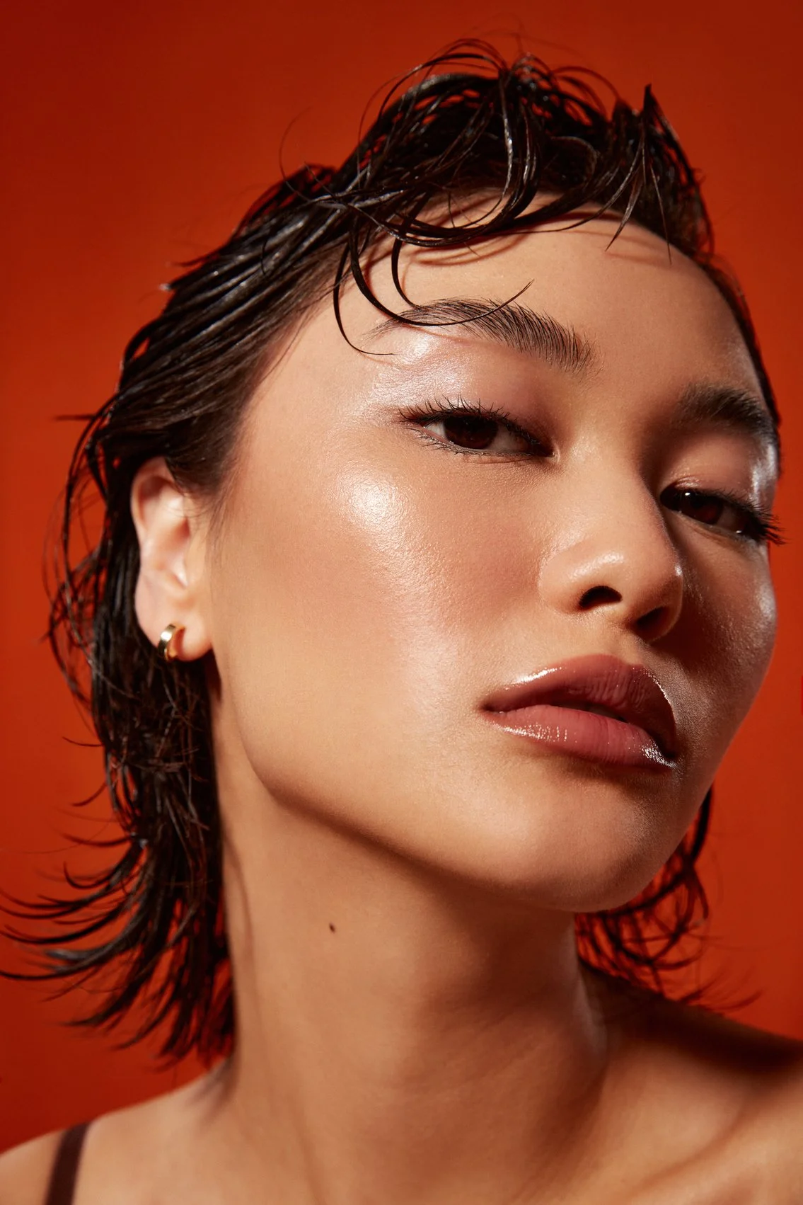Close-up of a person with glossy lips and wet hair against an orange background.