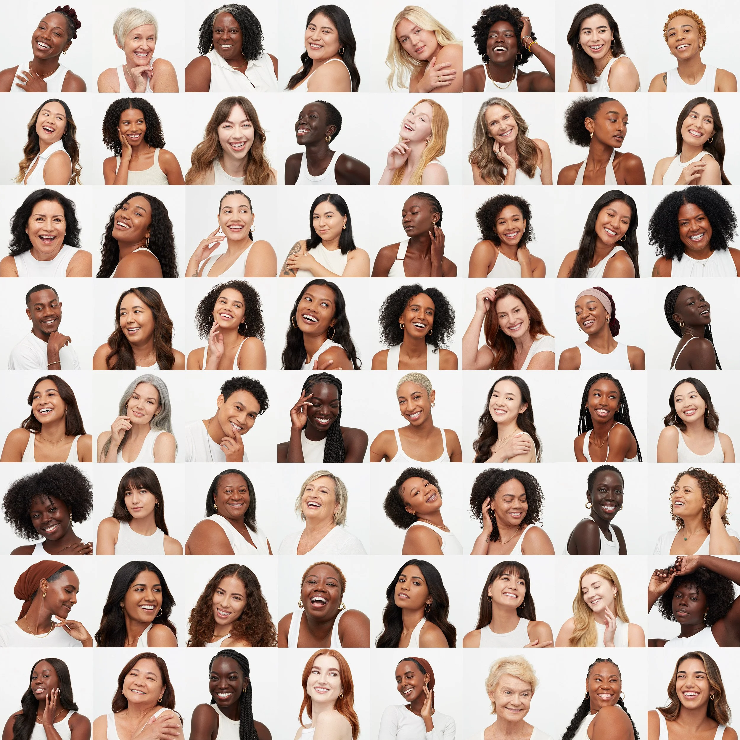 Collage of diverse women and men smiling in white backgrounds, showcasing a variety of hairstyles and skin tones.